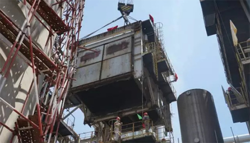 石油二廠蒸餾一車間檢修項目中余熱爐預(yù)熱器模塊更換任務(wù)是整個石化公司大檢修的關(guān)鍵核心工程。預(yù)熱器模塊位于爐體底部,總計重量260噸,更換過程中拆除配套煙道繁多,且多處位于高空,腳手架搭設(shè)及拆除安裝的測量定位難度較大,施工難度堪比預(yù)想。
